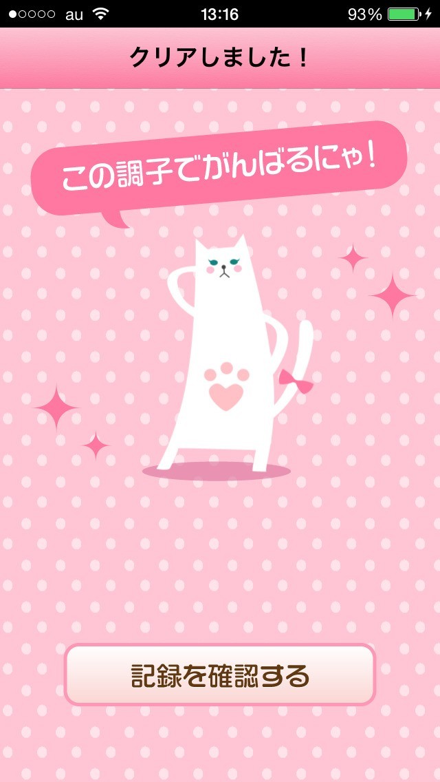 しっかり運動できたら、「CLEAR」ボタンを押してかわいいネコに褒めてもらえる