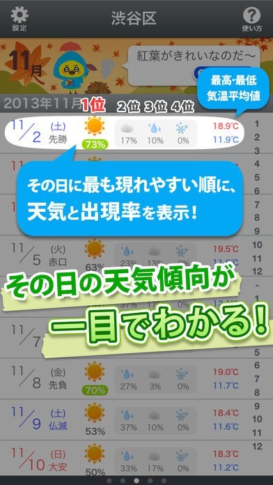 結婚式や大切な旅行など、どうしても天気になってほしい日はあります。過去30年のアメダスの統計から、その日が過去どんな天気が多かったのか知ることができるアプリになっています。天気だけでなく、平均気温も分かりますので便利です。天気と一緒に六曜も記載されていますので、結婚式などを控えている方にはおすすめです。