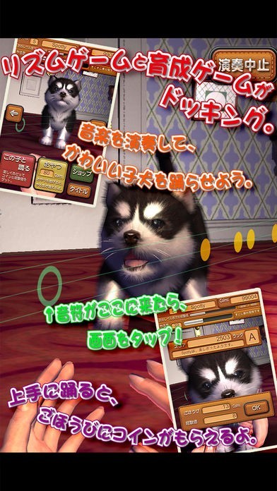 App Storeより引用音楽を演奏して、かわいい子犬を踊らせよう。