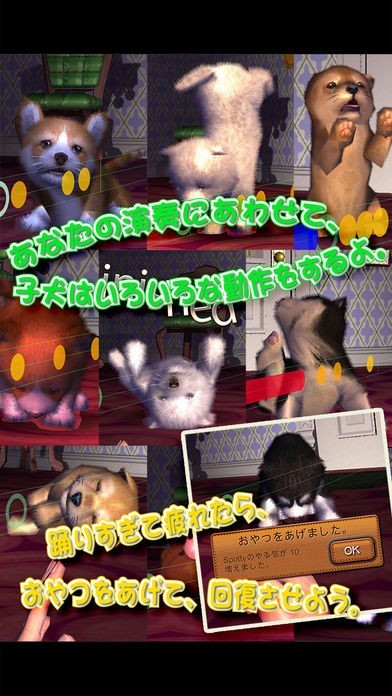 あなたの演奏にあわせて、子犬はさまざまなかわいい動作をします。