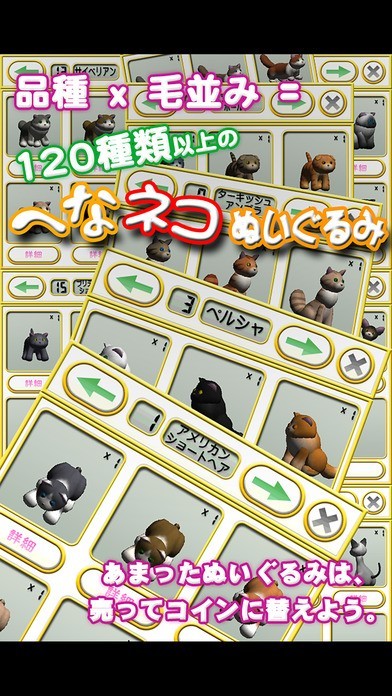 「へなネコキャッチャー」では、本物さながらのクレーンゲームを遊ぶことができます。ゆるくて可愛い子猫のぬいぐるみを景品として用意。アメリカンショートヘアーや日本猫、シャムなどの150種類が勢揃いし、猫好きさんにも最適です。クレーンでぬいぐるみをキャッチしたら、出口まで慎重に操作しましょう。ボタンタップで移動などの操作が可能。視点変更も自由に行える他、2本の指で拡大もできるため、移動角度やクレーンの引っ掛かり具合も細かく調整できるのが特徴です。すべてのぬいぐるみをコンプリートするやり込み要素も充実。いつでも手軽に遊べるため、本物のゲームセンターに行く前の予習としても活用できます。