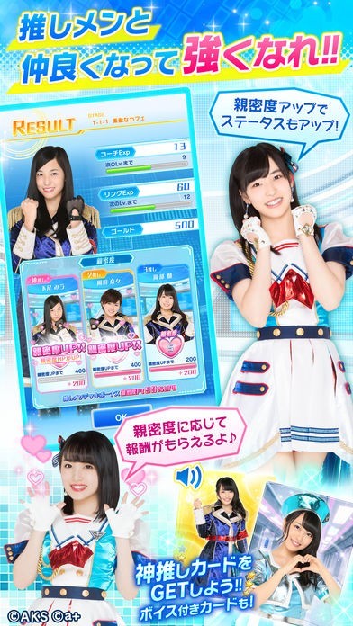 AKB48全メンバーのオリジナルボイスをさまざまなシチュエーションで聴くことができます。バトルの時は推しメンに応援してもらい、勝利の時は推しメンと共に喜べる!
