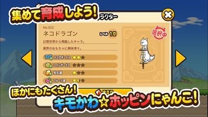 ゲーム内のガチャを引くと、ネコホッピング以外にも「にゃんこ大戦争」に登場するネコたちをゲットできます。どのキャラクターもホッピングに乗り、普段は見られない姿を見せてくれます。