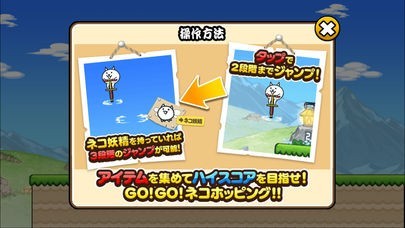 人気タワーディフェンスゲーム「にゃんこ大戦争」に登場するキモカワな人気キャラクター「ネコホッピング」を操作して、穴や障害物が待ち受けるコースをジャンプで進んで遊べます。