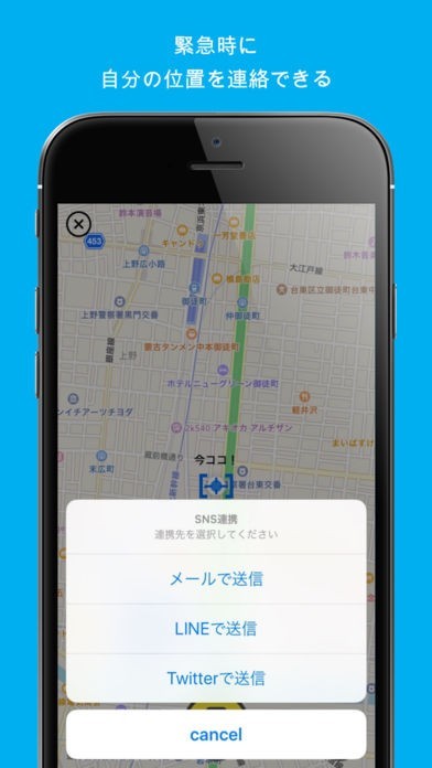 TwitterやLINE、メールを使って友人や知人、親族と連絡を取ることができます。自分がいる場所の地図や住所を合わせて送ることができるので、困った時に役立ちます。