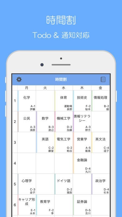 月曜日から金曜日まで行われる授業を一目で確認することができます。教室の場所を書き込むこともできるので、新学期になったばかりであっても迷わず教室に辿り着くことができます。