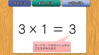 ・カードが表示されたら九九を読み上げるなどし、左右フリックで次のカードに移動してください。