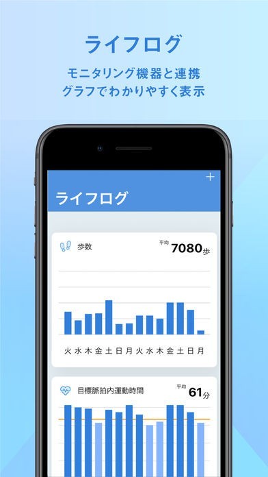 糖尿病や肥満、高血圧など、あなたの状態にあった適切な指導を行うために、iPhoneへ標準でインストールされている“ヘルスケアアプリ“と専用デバイス“Fitbit®“によって歩数や運動量、睡眠時間などのライフログデータを自動で取得します。