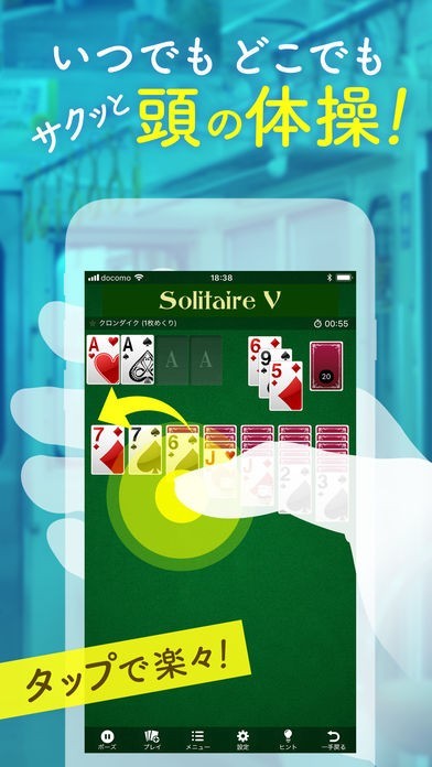 「ソリティアV」には100種類以上のソリティアが入っていますが、ルールを知らない人でも大丈夫。ヘルプやデモ、ヒント機能を利用できるので、すぐにゲームルールになれることができます。