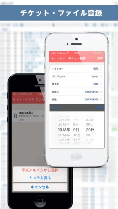 「RedminePM」は、プロジェクト管理システム「Redmine」専用アプリとして、便利な機能を多数搭載しています。基本機能ではチケット登録などの操作が可能。web上のシステムと同じように操作できるため、ちょっとした空き時間や、外出先でも活用することができるでしょう。添付ファイル機能を利用すれば、撮影した画像をその場ですぐに添付できるのも便利です。また、使いやすい検索機能も用意しています。フリーワードでの検索はもちろんのこと、チケットID検索やキーワード検索にも対応しており、お目当ての情報をいつでも探し出すことができるようになっています。