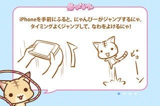 iPhoneを手前にふると、にゃんぴーがジャンプします。タイミングよくジャンプして、なわをよけよう! にゃんぴーがなわにひっかかるとアウト! 1ぴきもいなくなったらゲームはおしまいです。なわが速くなってきたらiPhoneを大きくふって大ジャンプ! 2重とびを決めて、新記録をねらおう!