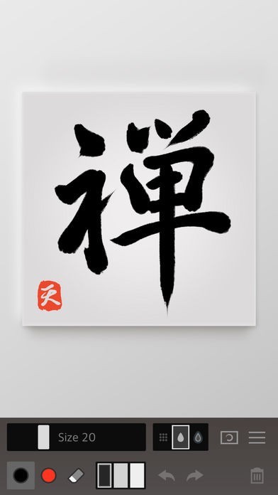 ZenBrush2は、和筆を使って力強さと美しさを表現した線を描いていきます。書き心地は筆に近く、半紙に書いていくようにかすれ具合を再現することができます。にじみの設定や濃淡は3段階あります。背景のテンプレートは92種類揃っています。背景や筆の太さ、にじみ加減は好みに合わせてタップで選択しながら自由に変えていきます。文字だけでなく、水墨画を描いていく感覚で絵を描くこともできます。ブラシ機能は、黒と朱色、消去ブラシがあります。黒以外に朱色の墨があるので、黒を朱色の2色で絵を描いたり、黒で字を書き朱色で添削する使い方も可能です。書道セットがなくても、いつでもどこでも書道を楽しむことができます。