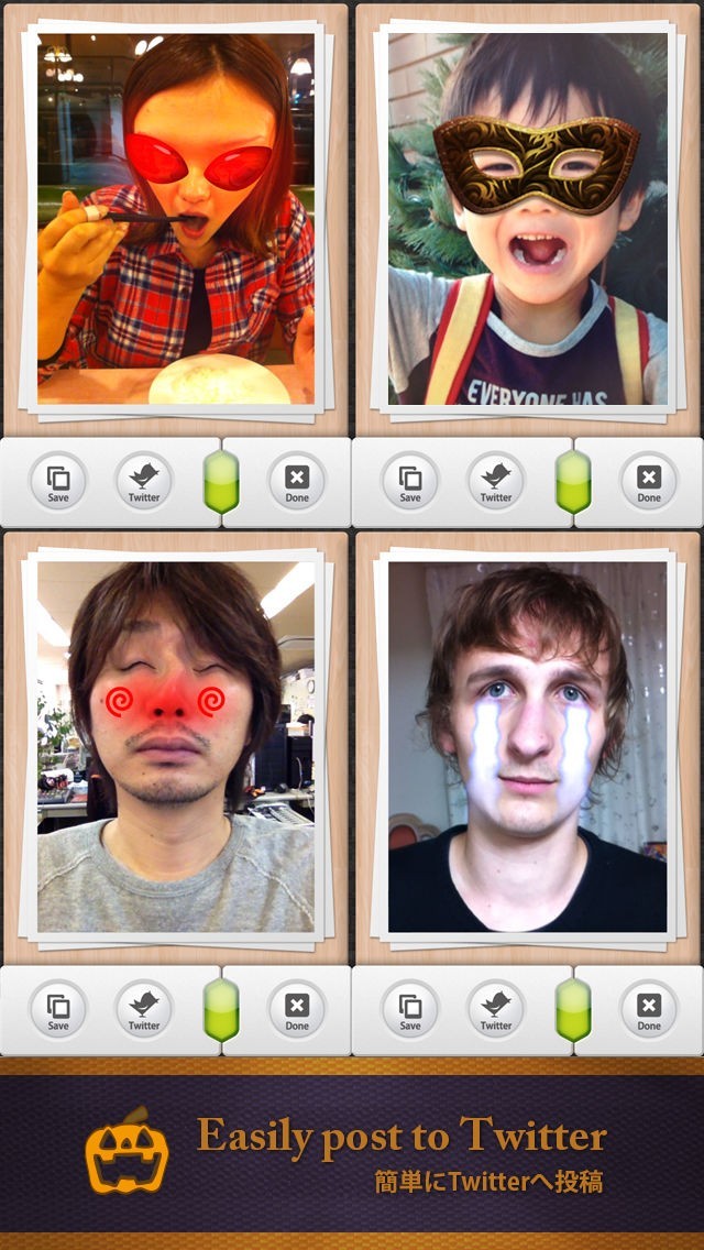 App Storeより引用リアルタイム変身アプリ「iEyeCamera」は、iOSの「顔検出」技術を取り入れたカメラアプリです。カメラのライブ映像から自動で顔を見つけ、目に特化したリアルタイムCGエフェクトを合成。デカ目や細目、メガネ、メラメラと燃える炎など、多彩なエフェクトを搭載。複数の顔を認識するので、みんなでワイワイ大爆笑間違いなし! 恋人と並んで撮影すれば、楽しいひと時をお約束。