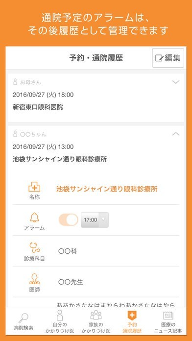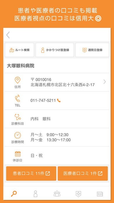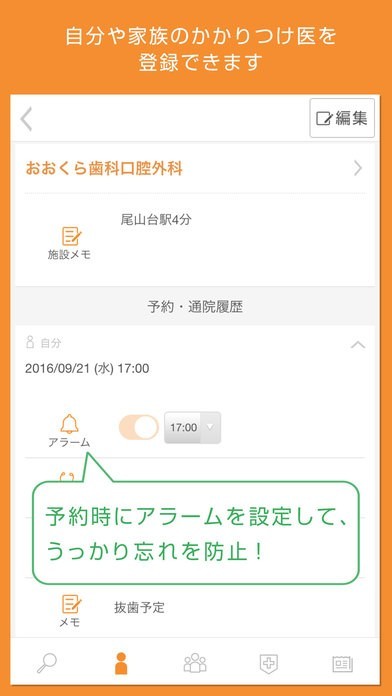 このアプリ内には17万件にも及ぶ病院の情報が載っているので、自分にピッタリの病院を見つけることができる可能性を高めてくれます。 よってまだかかりつけ医を決め兼ねている方は決定するきっかけにしてみてはいかがでしょうか。 「診療科目」、「地域・駅」を入力することで、ある程度通える範囲に絞ることが出来ます。 そして、患者さんのクチコミを見ることによって取捨選択をしていき、気になった病院があれば、予約してみましょう。 予約はアプリ内で日付を記載し、さらには時間になるとアラームで教えてくれるので、忘れてしまう心配はなくなります。 そのようにして決定した場合「かかりつけ医登録」でしっかりと登録して大事にしていきましょう。
