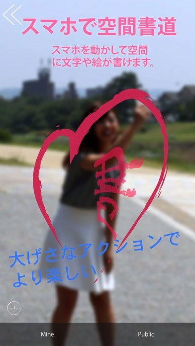 空間に文字を書くことができるARアプリです。スマホが書道の筆になって、スマホを動かすことで文字を書いていきます。筆の太さや形は速度や動きによって変えることができます。書いた文字はアプリ内で友達と共有することができます。 カメラで撮影した景色の中に文字を書き込むことができるので、メッセージを書いたり、待ち合わせの情報を加えたりと思い思いの利用法があります。スマホを動かして書くので、最初は難しいですがコツを掴めば複雑な漢字や絵なども書けるようになります。