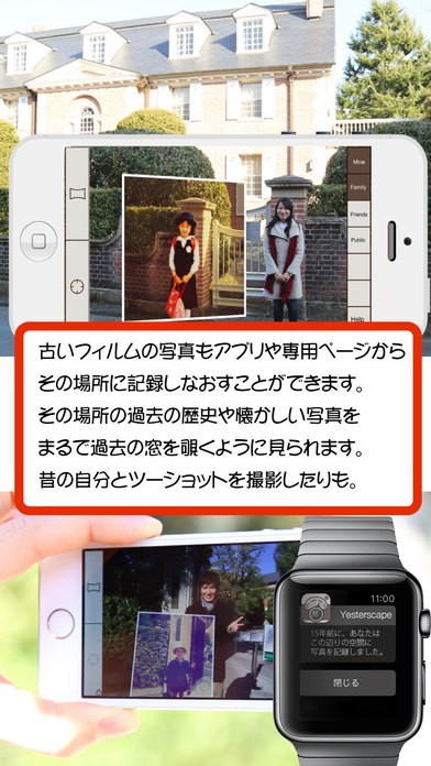 「Yesterscape」をつかって映し出せば、過去の様子を表示してくれるので、現在にいながらも過去について思いを馳せるといったことも出来ます。 それと同時に自分で過去に撮影した写真を登録することによって、過去の風景を残すのに一役買うといったことも合わせてできます。 また、同じ場所での時間の変化による風景の変化についても知れます。 以上のことから、多くの人に使っていただけることでよりたくさんのデータを集めることが出来ますし、たくさんの歴史の風景について見ることができて、楽しさを感じることもできます。