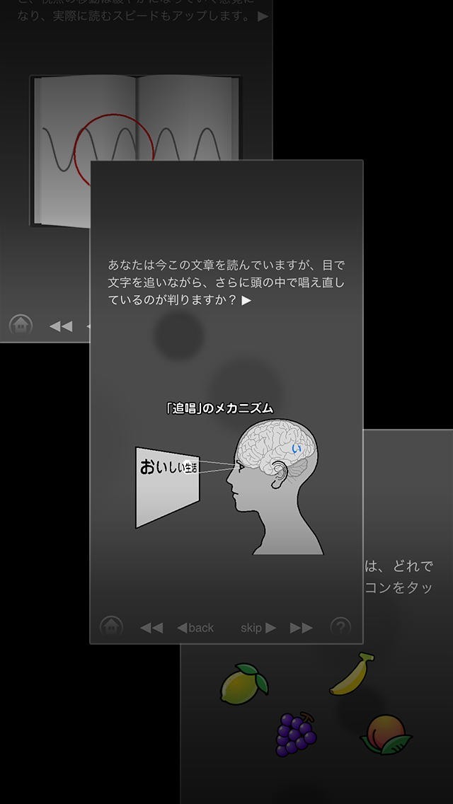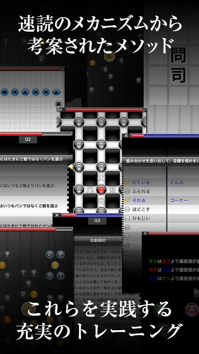このアプリには脳トレ感覚で、楽しみながら速読メソッドを身につける10種類のトレーニングが収録されています。