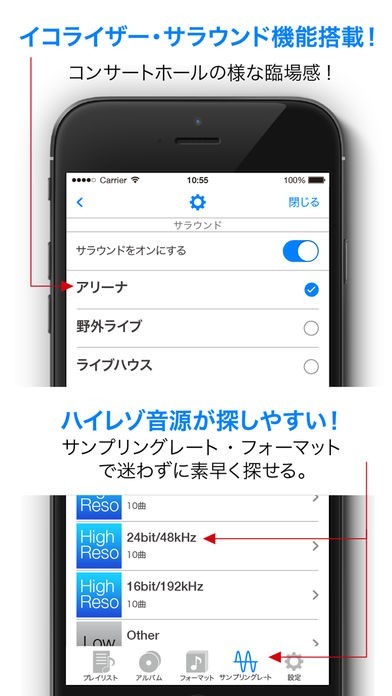 ハイレゾ再生対応 音楽プレイヤーアプリ[NePLAYER]では、イコライザー機能で好みの音にでき、非ハイレゾ音源のアップサンプリングでの高音質化も可能でこれまでの音楽もより良い音で聞けます。