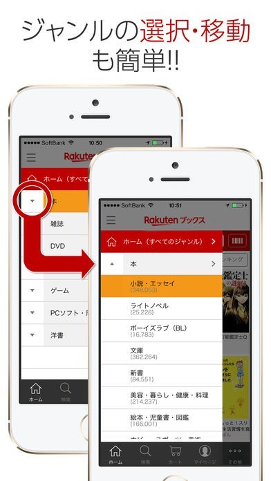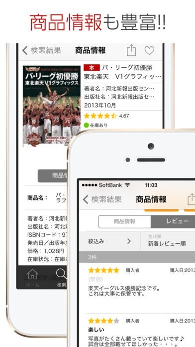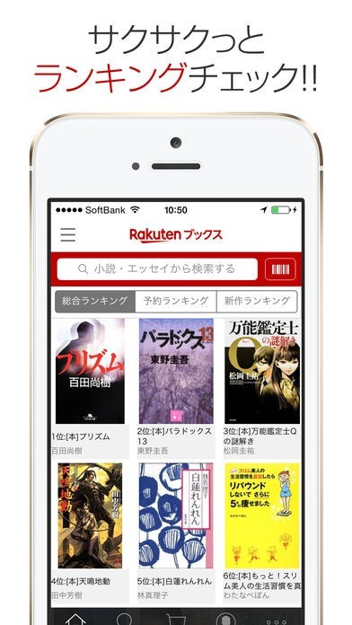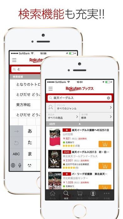 スマートフォンを使って楽天の250万点以上の豊富な在庫の中から欲しい本やDVDなどを探すことができるアプリとなっていて、24000店以上のコンビニで受け取ることができます。