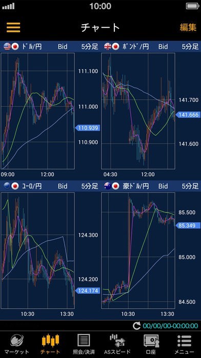全画面、4チャート同時表示に切り替えられ、通貨間の値動きの比較やトレンド把握が可能です。