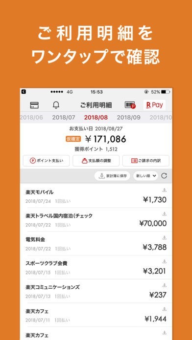 明細をさくさく確認出来る、楽天カードアプリ。