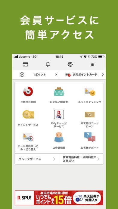 簡単アクセスで楽天e-NAVI機能を使用することができます。登録情報の変更や分割支払の切り替えなどWeb限定の機能がスマホでも利用できます。さらにポイントサービスに登録して特典も受けられます。