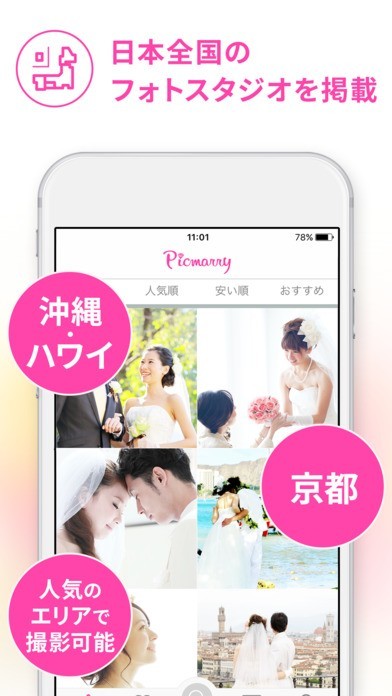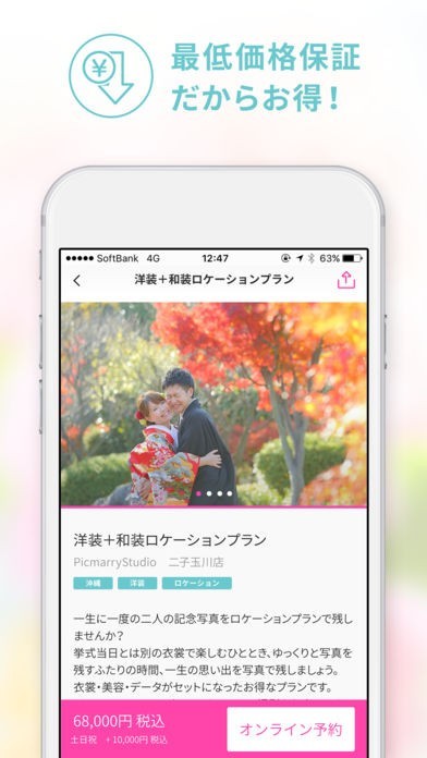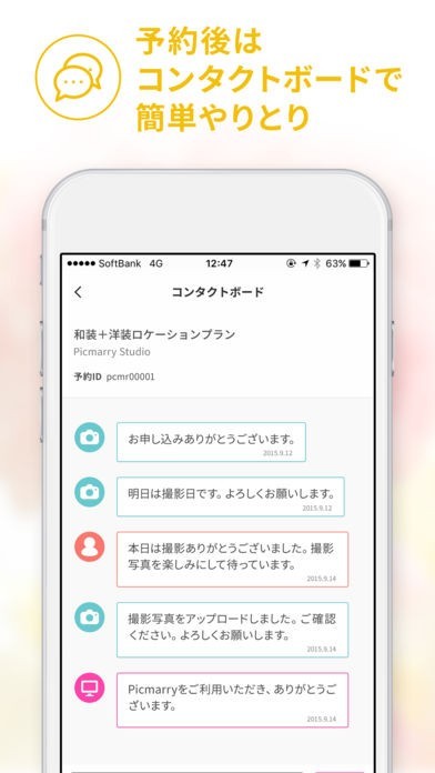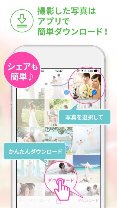 豊富なサンプル写真の中からウェディングドレスや和装などの花嫁衣装、国内の結婚式場やスタジオ、海外のビーチや教会など様々なロケーションからご希望のスタイルの撮影プランを検索しアプリ内で予約が可能です。アプリを使って予約後のスタジオとのコミュニケーションや、撮影データのダウンロードができるため、結婚準備に大活躍のアプリです!!