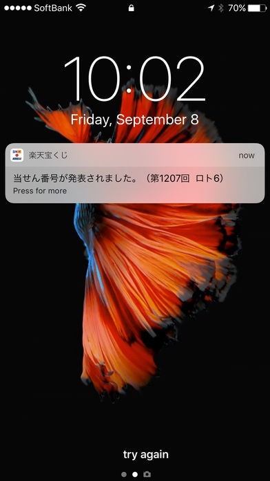 宝くじ販売の締め切り日や当選結果の発表日など大事な情報を素早く受け取れるようにプッシュ通知でお知らせしてくれます。また、アプリトップから確認すると常に販売締め切り日までの日数と時間が表示されています。