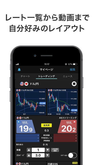 マイページに表示するレートやチャートなど選ぶことができ、レイアウトも自由なので使いやすくカスタマイズすることができます。取引パネルもスマホで操作しやすい位置に配置できます。