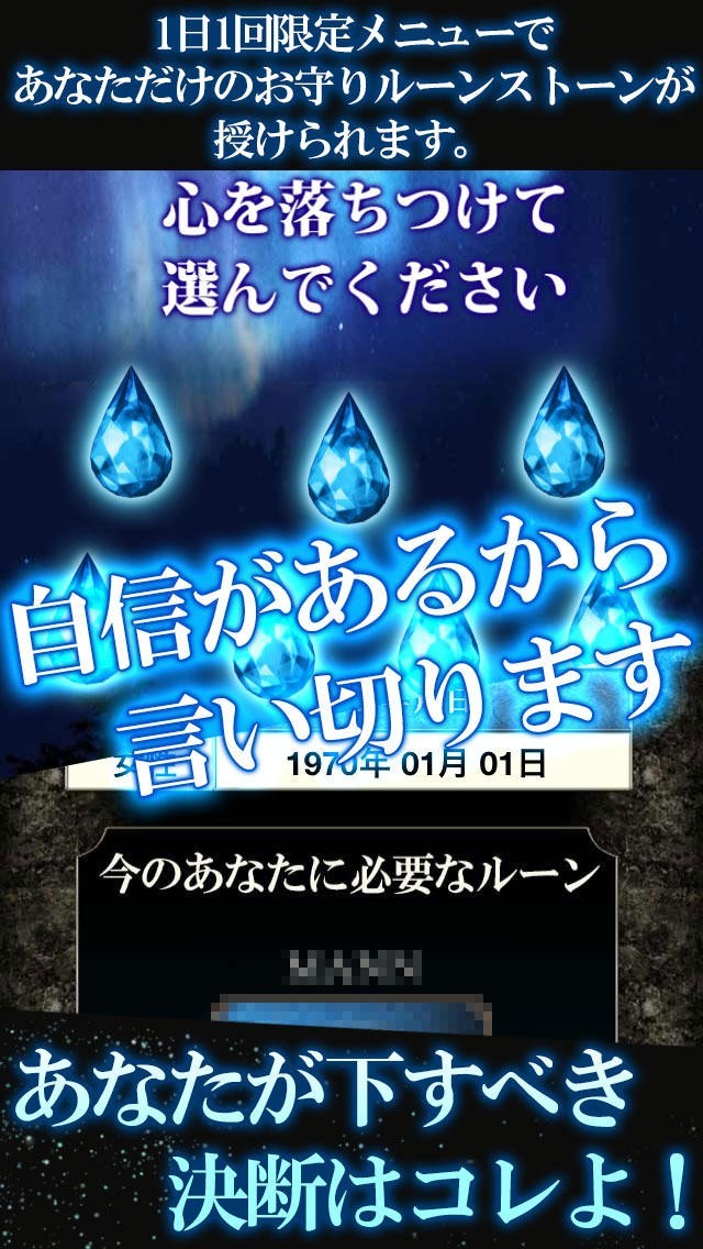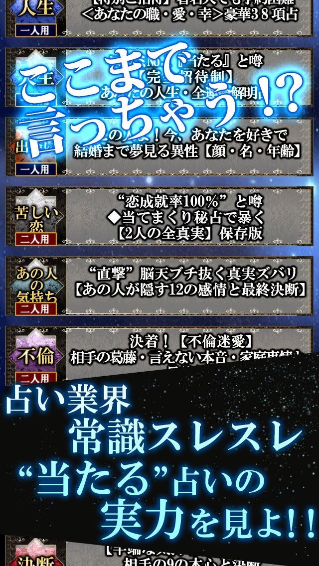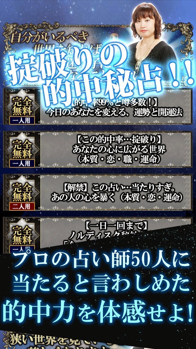 「占い師を選ぶときは評判や口コミを参考にしたい」人はこのアプリがおすすめです。50人の占い師たちが99%当たると太鼓判を押している占いがアプリになりました。あなたの生年月日をもとに運勢を導いてくれるのでお時間は取らせません。だからスキマ時間でどんどん占っちゃってください。無料で占えるメニューが充実していて、特に恋愛に定評があります。恋愛は占って欲しいオーダーのナンバーワンと言っても過言ではありません。それを無料で占えるのですから、恋多き女性男性は要注目です!無料コースにアップデートをすればもっとたくさんの占いができますから、おいおい検討して行けば良いでしょう。