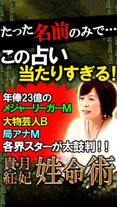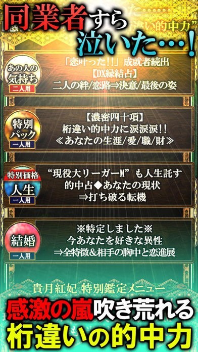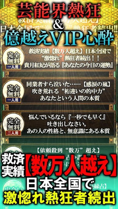 このアプリを使えば、大物メジャーリーガーなど数万人を救済した鑑定師「貴月紅妃」さんの生年月日や姓名を使った鑑定を見ることができます。 「あなたの今日の運勢」では、テレビでわざわざ占いをチェックする必要がなく、より役立つ情報が得られるので、スマートフォンでニュースをチェックするついでに毎日確認するという使い方をすれば、その日を良い一日にすることができます。よって、ターゲットはすべての方があてはまりますが、特に現状に不満を感じている方が使うことで、救済してくれて、よりよい人生になるかもしれません。 他にも有料では、「【赤裸々暴露】二人の宿縁」によって、想い人との関係をはっきりと教えてくれるので、付き合おうか迷っている方が使うことで、どちらかを決断して一歩前に進むことができます。