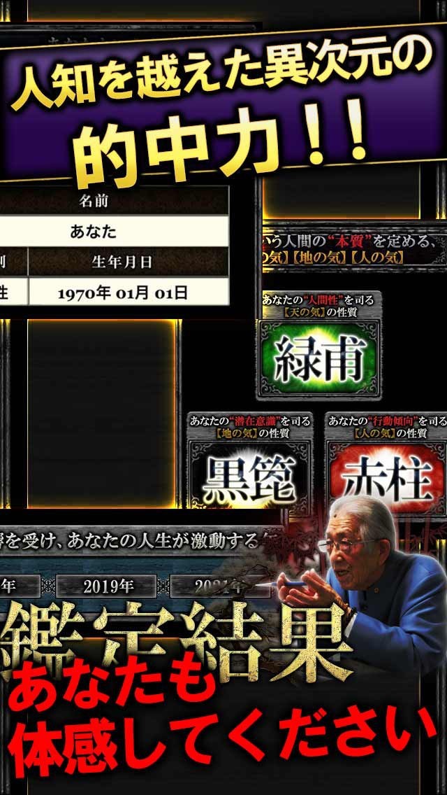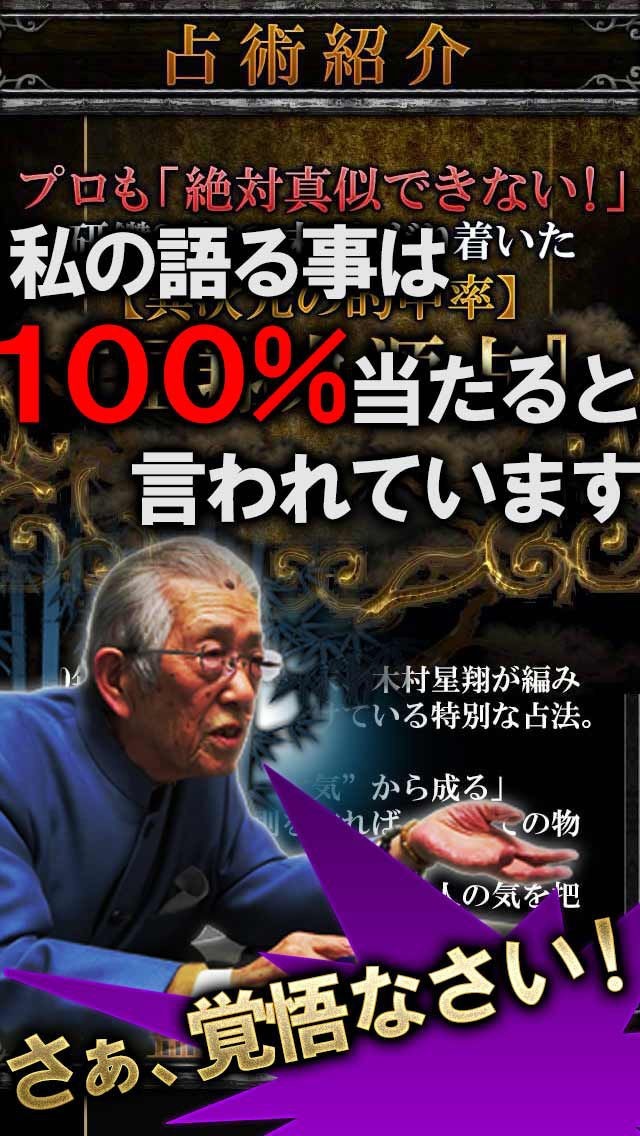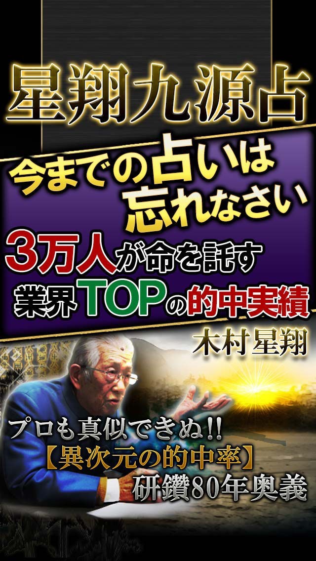 App Storeより引用今までの占いは忘れなさい。3万人が命を託す“業界トップの的中実績”研鑽80年「木村星翔」があなたに贈る本物の占い「奥義の書:星翔九源占」