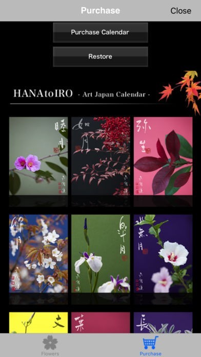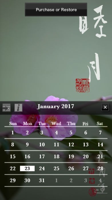 写真家の新倉万造さんの作品から選ばれた花の写真を楽しむことができるアプリです。京都で撮影された美しい花の写真と背景の色が絶妙に組み合わされています。12枚の写真が用意されていて、それぞれ一月に対応してカレンダーを表示することができます。日付をタップすることでメモを入力することができるのでスケジュール管理にもなります。 花の写真には揺れる動きがつけられているので、そよ風に吹かれているように見えてより美しさが増しています。