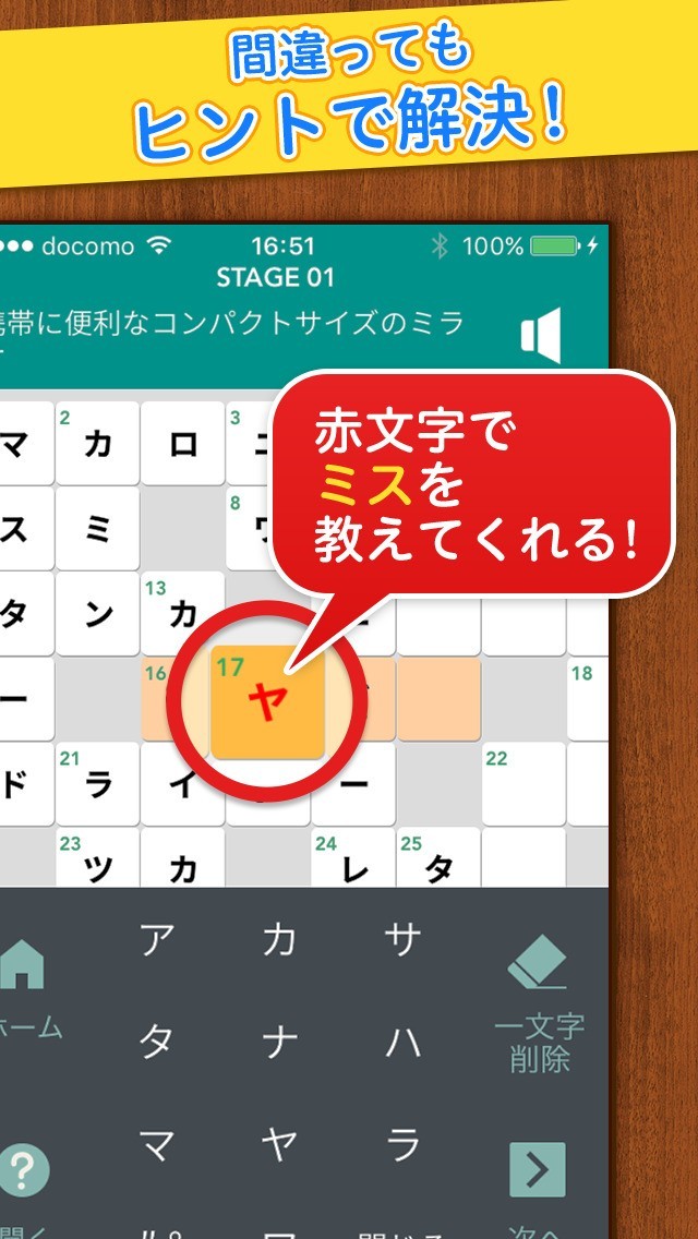 便利な間違い通知機能を使えばクロスワードが苦手な人でもつまずくことなくクリアできます