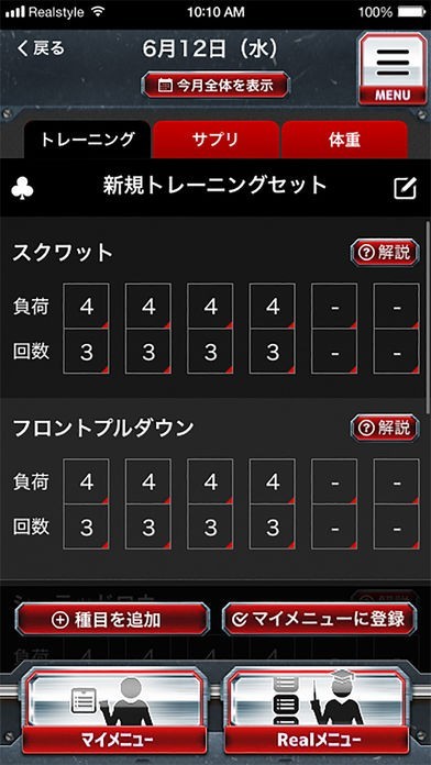 トレーニング記録機能を利用することで、その日に行ったトレーニング内容を毎日記録しておくことが可能です。種目ごとに行った運動強度やセット数をサクッと記録しておくことができるので、次回のトレーニングでも役立ちます。