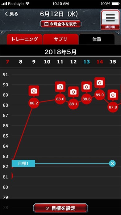 毎日の体重測定した数値も記録しておくことができます。体重と一緒にその日のボディの写真を撮影して一緒に保存しておくことが可能で、写真はアプリから直接TwitterなどのSNSに投稿することが可能となっています。また、記録している体重は棒グラフでチェックできるので、体重の変化が分かりやすくなっています。