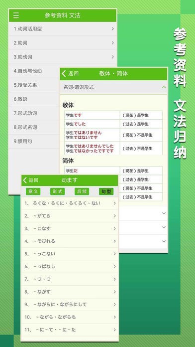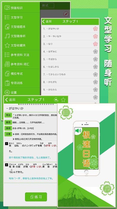◎学习页面配有每个文型的用法说明、例句、例句音频;