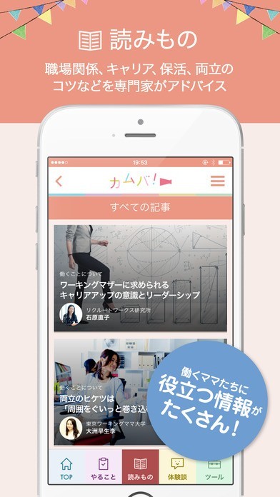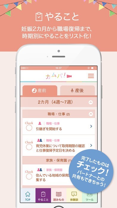 「カムバ! 」では、妊娠してから、職場復帰までの計画をしっかりと建てることによって、スムーズに働けるようになるアプリです。 月ごとにやることがチェックリストとして載っているので、うっかり忘れてしまうということは無くなります。例えば、2ヶ月(4週~7週)では、「引き継ぎを開始する」、「育児休業の取得期限の確認と仕事復帰予定日の決定」などをする必要があり、しっかりと行えば、マークをタップして完了したことを確認できます。 他にも体験者の方の体験談を見ることが出来るので、参考にすることができます。