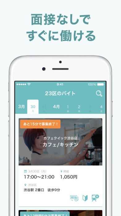 働きたい日付の求人一覧から希望の求人を見つけたり、求人検索機能を使って、勤務開始日時や未経験者歓迎などの条件を使って、希望の求人を絞り込むことができます。