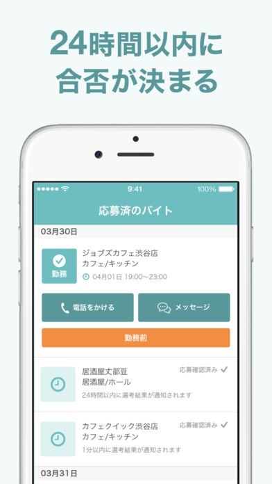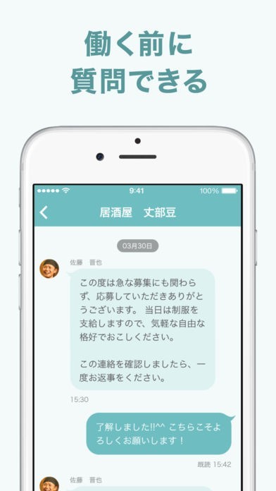 アルバイト先にメールアドレスなどを教えなくても、採用が決まったお店と仕事の連絡をアプリ内で行えます。