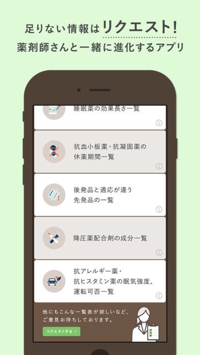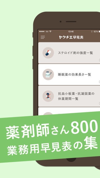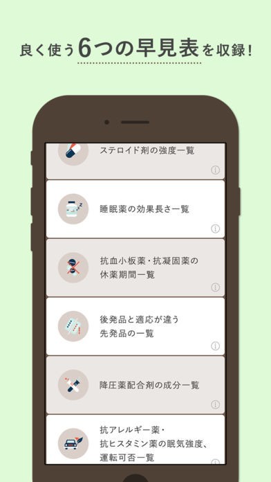 ヤクチエ早見表は、薬剤師が知識を必要になる6種類の一覧をすぐに確認できます。投薬時の確認は、時間をかけずに早見表で探せます。知識を増やせ、正確に業務をこなすことができます。