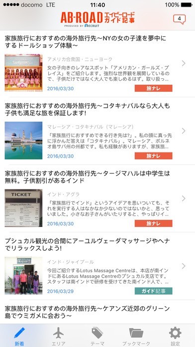「AB-ROAD 海外ガイド記事」では、海外ニュースや旅行記事の配信機能などを搭載しています。海外在住のライターによる各種記事は、旅行先を探している方にとっても役立つ情報がたっぷりと含まれており、現地ならではの最新ニュースに触れられるのも嬉しいポイントとなっています。10000記事以上が常時配信されているため、気になるスポットについての記事も発見することができるでしょう。好みの記事や気になる情報はブックマーク機能へ登録しておけば、時間がある時にゆっくり見返すこともできます。また、エリア別の記事表示機能も搭載しており、旅行予定の国の記事を手軽にチェックできるのも特徴です。