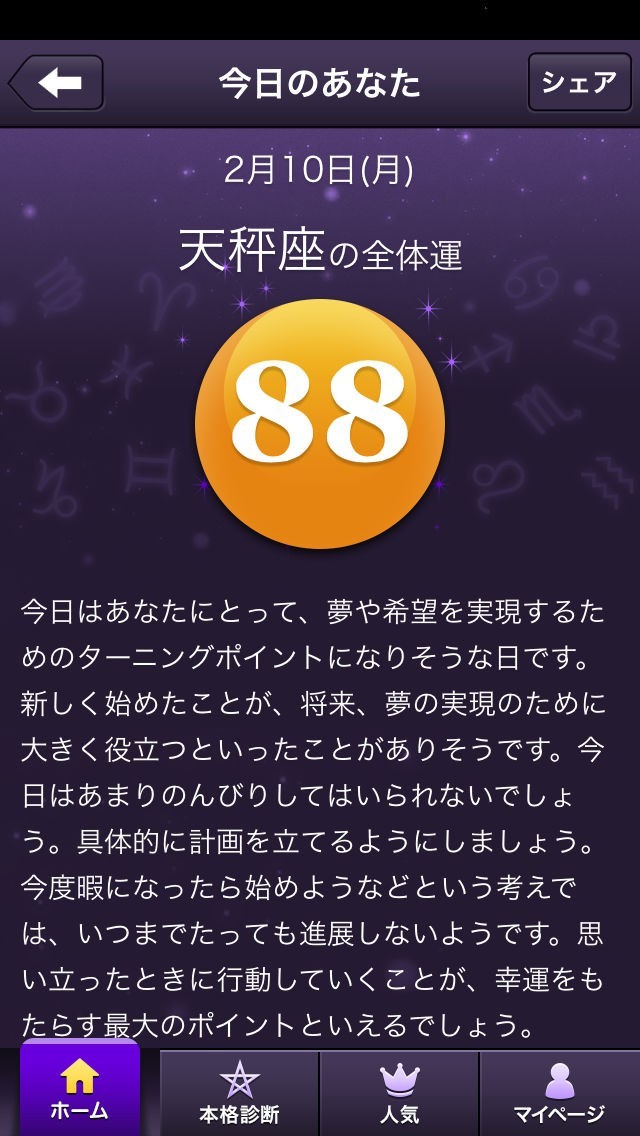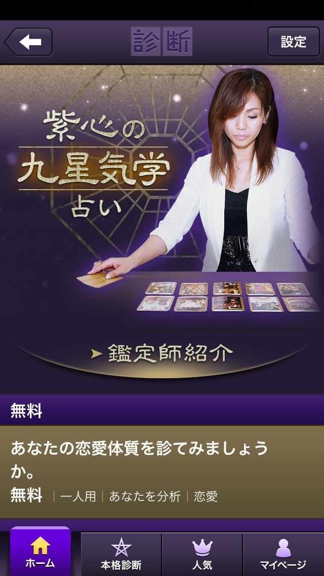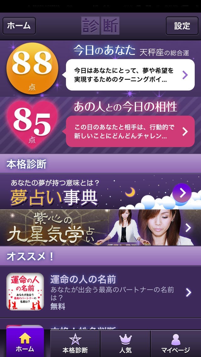 「診断ティキット」を使うことで、300種類もの占いを無料で利用することができるので、いろいろな気になることを占いを参考にして役立てることができますし、いろいろなことに悩んでいる方の助けになり、すべての方のお悩み解消の役割を果たします。 中でも「毎日の運勢」を見ておけばその日気をつけておくべきことを把握できるので、最悪の事態を避けることにつながるので、毎朝のメールチェックと一緒に見ることで大きな役に立ちます。 他にも気になる方との「相性占い」を見ることができるので、恋をしている方がチェックすることによって、恋愛がうまくいく可能性を高めることができます。 加えてアプリ下部の「人気」タブをタップすると人気の占いの一覧を見れるので、その中から気になったものをやってみることもできます。 さいごに有料で「本格診断」もできるので深い悩みを抱えている方が頼れる場としても活用することで真剣な悩みをしっかりと聞いてもらえます。