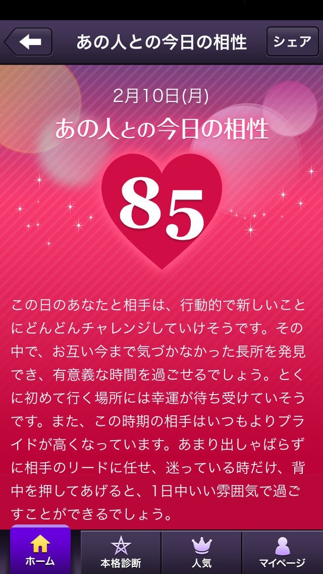 気になるあの人との恋愛の行方や相性を確認したいという女性の方にピッタリの占いアプリが「診断ティキット」です。相手の生年月日がわかれば占うことができるので気軽に挑戦することができます。逆に占いアプリを使用するためという口実で相手の誕生日を教えてもらうことにもつながりますよ!相性や自分の運勢が点数で表示されるので前回の占い結果との違いが一目でわかるようになっています。占い結果には自分の改善点や運気をアップさせるためのポイントが記載されているので見逃さないようにしましょう。占いを行った結果は毎日変わるのでその日の運勢を占うためにも使えます。