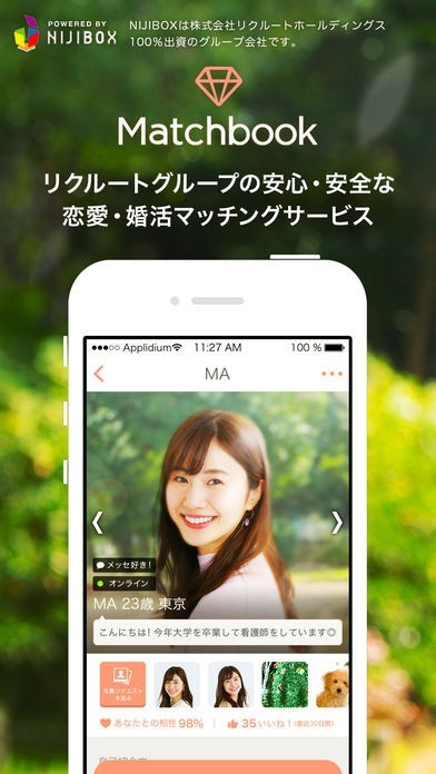 「Matchbook(マッチブック) - 出会い・恋活・婚活マッチングアプリ by リクルートグループ」は、婚活や恋活を応援するマッチングアプリです。リクルートグループのNIJIBOXが提供しているため、サクラやセキュリティの面で不安を持つ人でも安心して利用できます。 このアプリではFacebook上に友だちが10人以上いないと利用できないなどの制限がありますが、 基本的にマッチング成立までは男女ともに無料で利用できるため、安心できる環境で出会いを求めたい人に適しています。また、このアプリはイニシャルで利用できるため、実名での利用に抵抗がある人も安心です。