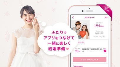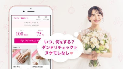 結婚情報誌“ゼクシィ”の内容を、そのまま活用できるアプリです。 結婚するにあたって必要な、結婚式場や指輪、衣装探しはもちろんのこと、エステや新生活の準備などまでシッカリカバー。しかも、アプリだと検索機能で簡単に探すことができます。 さらに、情報は常に最新で、二次会から、ブライダルフェアの申し込み、内祝いの購入までできてしまう。 なんと言ってもアプリ最大のメリットは、“ダンドリチェック“機能です。挙式日を登録すると、時系列にそってやることリストを表示してくれます。リストの項目をチェックマークで埋めていくと、準備の状況をパーセンテージで表示。進捗状況を一目で把握できます。 そのため、見落しなしで計画的に準備を進めることができます。