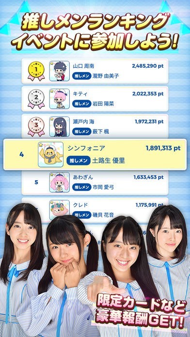 7ならべのゲームを通して自分が応援しているメンバーと親密な関係になれる可能性があります。カードの覚醒や秘密のメッセージ交換などで楽しめる事が出来るのが魅力的なゲームです。