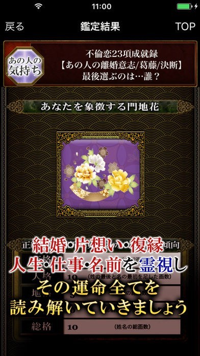 App Storeより引用名前は与えられた時から霊力を持ちます。あなたの名前がどんな霊力を持ち、人に影響を与えているのか。本鑑定では名前に隠された系譜の謎を読み解くころで「あなた」を明らかにしていきます。