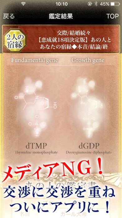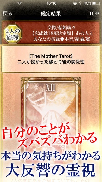 このアプリでは、様々な運勢を占って貰う事が出来ますが、とりわけ結婚運についての鑑定に強いのが特徴です。助言が的確で、仮に悪い運勢だった場合でもありがたい言葉を頂けます。
