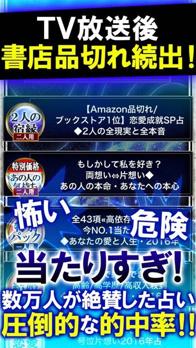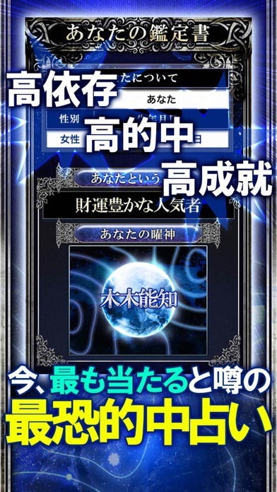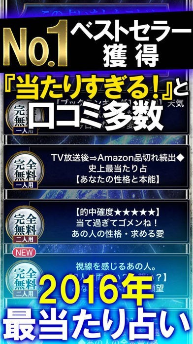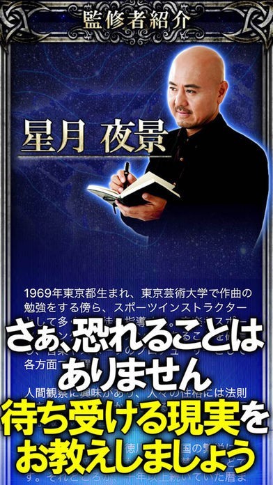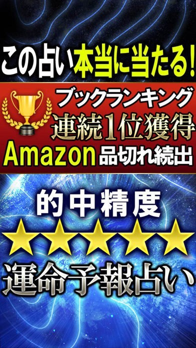 AppStoreブックランキング1位を獲得・本当に当たると話題となり、テレビで絶賛!Amazon売り切れ続出!天気予報より当たる最高精度の的中率・運命予報占いがついにアプリに登場します。怖ろしいほど当たるという口コミのみで広がり、数万人から絶賛された驚異の運命予知法で、監修者「星月夜景」があなたの現実に迫ります。2016年の初占い。運命予報をお楽しみください。